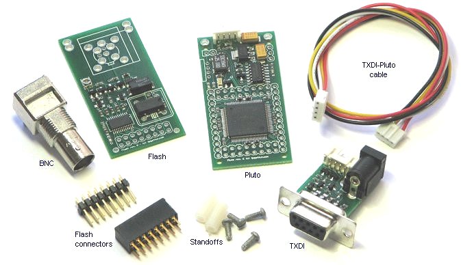 - Use a Pluto-II instead of a Pluto (Pluto-II has a boot-PROM so can be active at power-up, and the bigger FPGA allows more features in the oscilloscope). Or even a Pluto-3 and a FlashyD to get a two channels oscilloscope. Or use a different Flashy revision - for example rev. K allows precise frequency measurements and equivalent-time sampling.